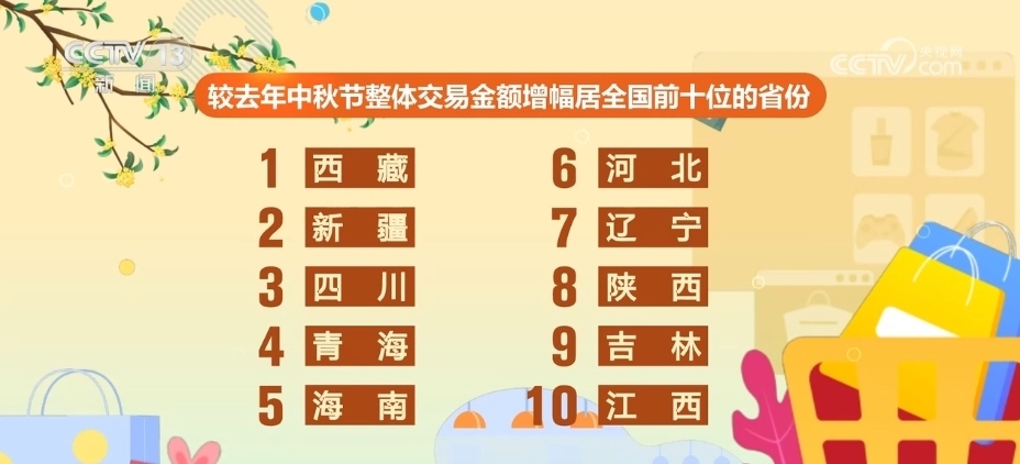 從地區(qū)上看,較2022年中秋節(jié)整體交易金額增幅居全國(guó)前10位的省份,分別是西藏、新疆、四川、青海、海南、河北、遼寧、陜西、吉林、江西。