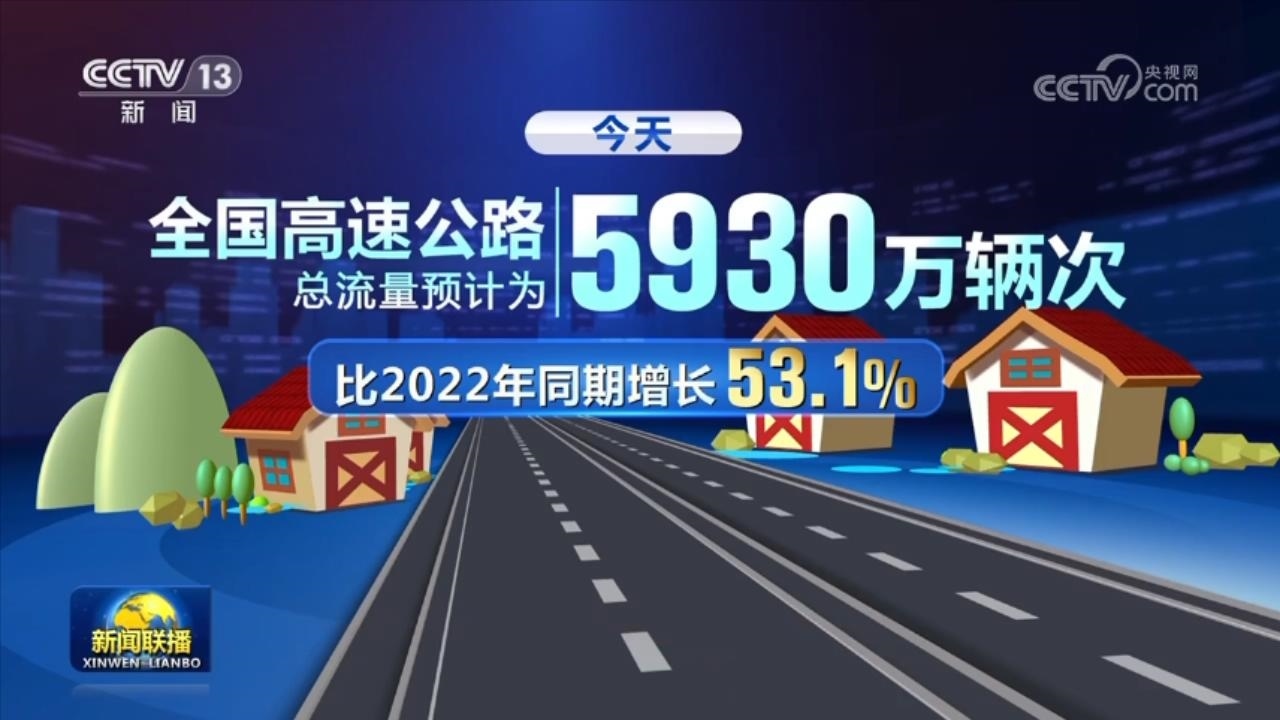 今天,全國(guó)高速公路總流量預(yù)計(jì)為5930萬輛次,比2022年同期增長(zhǎng)53.1%。