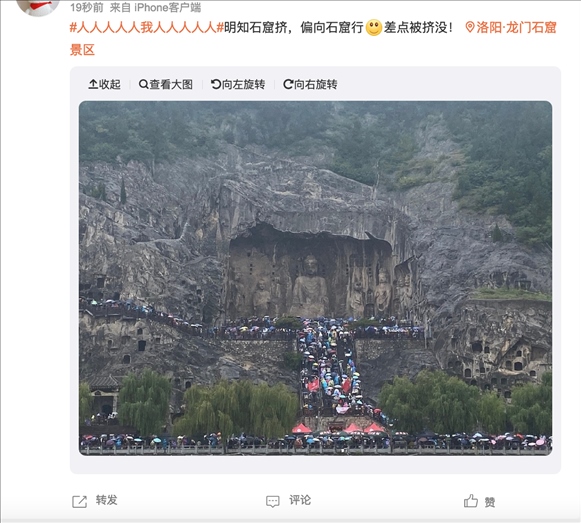有定位在龍門石窟景區(qū)的網(wǎng)友發(fā)布圖片并配文稱:“明知石窟擠,偏向石窟行。差點被擠沒!”