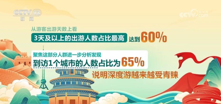 中國移動梧桐大數據借助通信服務、算力網絡,對全國用戶漫游、通信等數據進行統(tǒng)計分析后發(fā)現,從9月29日至10月6日,各地旅游人數和相關消費均大幅上漲。其中,短途游熱度不減,中長途游持續(xù)升溫。200公里以內的短途游占比達到38%;200—500公里的中等距離出游占比32%;500公里以上長途游占比為30%。從游客出游天數上看,3天及以上的出游人數占比最高,達到60%。聚焦這部分人群進一步分析發(fā)現,到訪1個城市的人數占比為65%,說明深度游越來越受青睞。