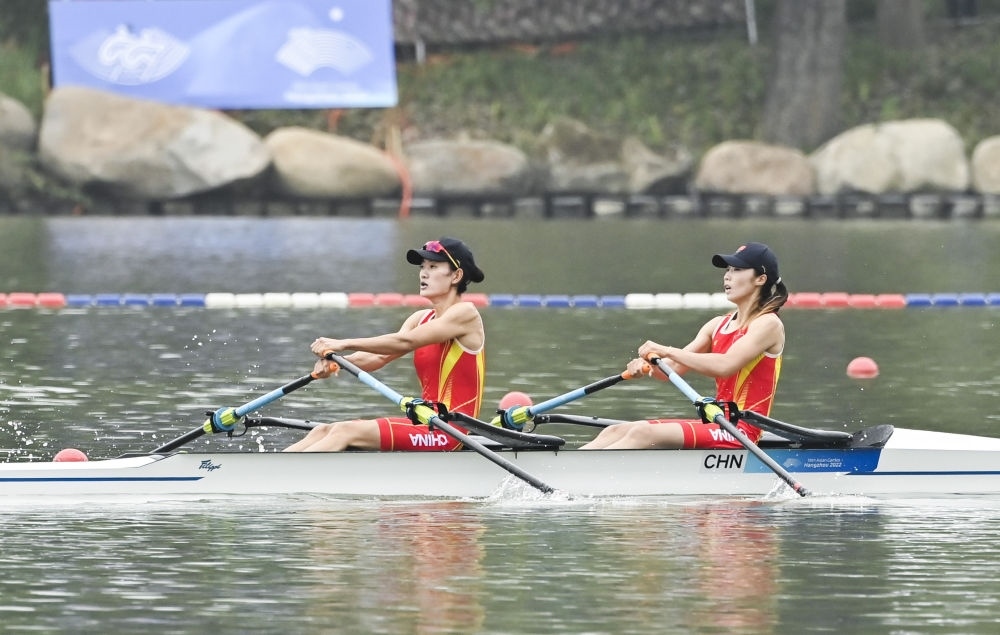 9月24日,在杭州亞運(yùn)會(huì)賽艇女子輕量級(jí)雙人雙槳決賽中,中國組合鄒佳琪/邱秀萍以7分06秒78的成績(jī)奪得冠軍,斬獲本屆亞運(yùn)會(huì)首金。這是鄒佳琪(右)/邱秀萍在決賽中。新華社記者 江漢 攝