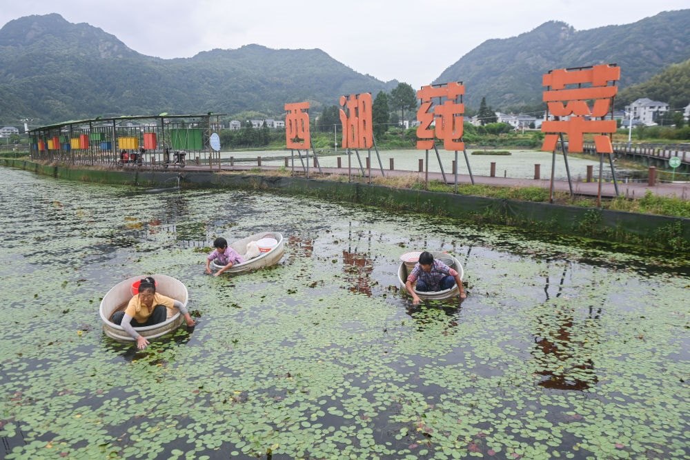 9月5日,在浙江省建德市航頭鎮(zhèn)烏龍村莼菜基地,村民劃著“盆船”在西湖莼菜產(chǎn)業(yè)園種植基地的水面上采摘西湖莼菜。近年來,浙江建德市航頭鎮(zhèn)以黨建聯(lián)建為紐帶,圍繞轄區(qū)特色農(nóng)業(yè)產(chǎn)業(yè)園建設(shè),發(fā)揮新鄉(xiāng)賢、鄉(xiāng)土人才、農(nóng)創(chuàng)客作用,在烏龍村投資600余萬元新建了占地1900平方米的西湖莼菜產(chǎn)業(yè)園,引導(dǎo)新鄉(xiāng)賢爭(zhēng)當(dāng)農(nóng)業(yè)致富帶頭人,打造西湖莼菜共富工坊。新華社記者 徐昱 攝