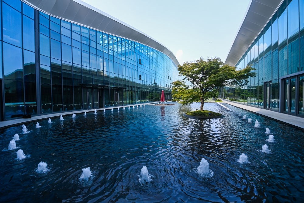 這是杭州富陽水上運(yùn)動(dòng)中心的中庭花園(8月24日攝),水池中的水來自于循環(huán)利用的雨水。新華社記者 徐昱 攝