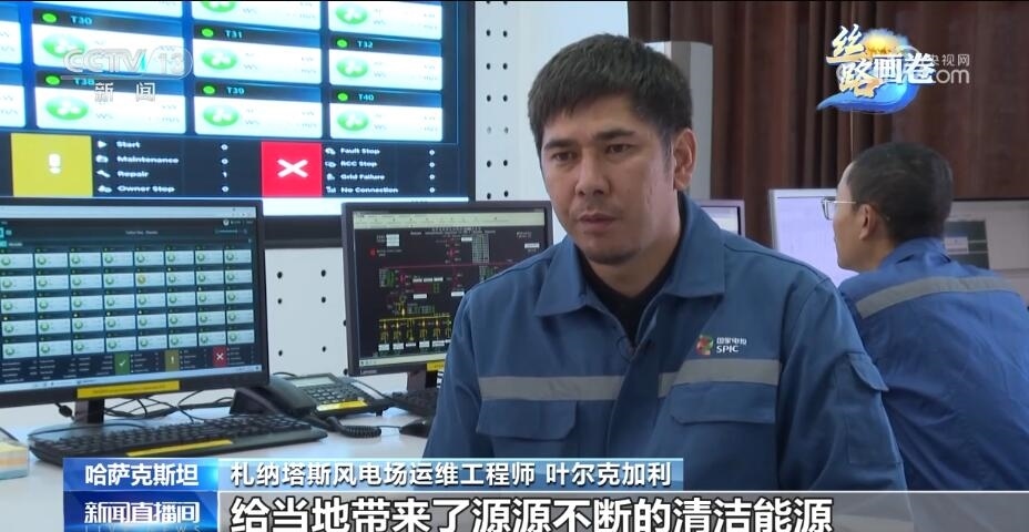 總臺記者 張譽(yù)耀:這里就是札納塔斯,哈薩克斯坦最大的風(fēng)力發(fā)電場之一,像我身后這樣一座風(fēng)能發(fā)電機(jī)能滿足當(dāng)?shù)丶s4000戶家庭的用電需求,而我身后一共有40座這樣的風(fēng)能發(fā)電機(jī),也就是說能夠滿足當(dāng)?shù)?6萬戶家庭的用電需求。正是這一座座轉(zhuǎn)動(dòng)的風(fēng)能發(fā)電機(jī),點(diǎn)亮了札納塔斯這座小城的日常生活。