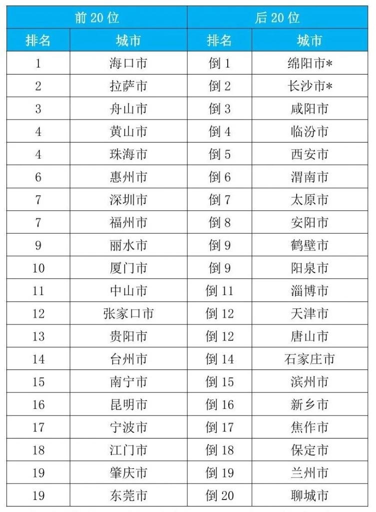 從重點城市排名看,1至9月,168個重點城市中,空氣質(zhì)量排名前20位城市依次是??凇⒗_和舟山等城市(從第1名至并列第19名);空氣質(zhì)量排名后20位城市依次是綿陽、長沙和咸陽等城市(從倒數(shù)第1名至倒數(shù)第20名)。據(jù)了解,綿陽市的一個監(jiān)測站點4月和5月、長沙市的一個監(jiān)測站點6月受到嚴重人為干擾,生態(tài)環(huán)境部對所在城市當月六項污染物濃度進行了最大值替代處理。(記者高敬)