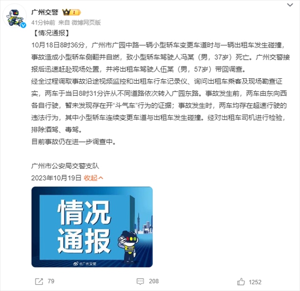·廣州交警通報寶馬車與出租車發(fā)生碰撞后撞上橋墩起火、駕駛人死亡事件:兩車均超速、未發(fā)現開“斗氣車”。出租車所屬公司發(fā)聲:司機已盡力剎車,但確實存在超速。