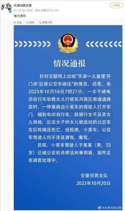 ·天津警方通報(bào)“兒童遭開門殺后被公交碾壓死亡”:小客車駕駛?cè)艘驯恍淌戮辛?,案件正在調(diào)查處理中。