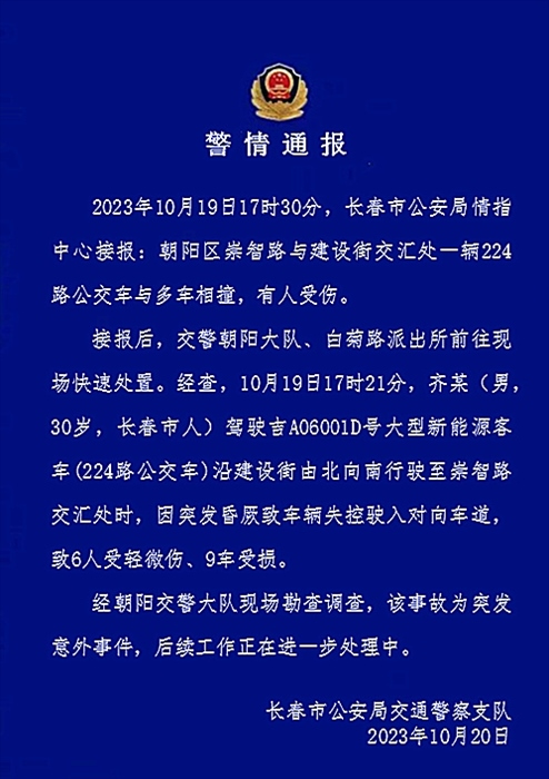 ·長(zhǎng)春交警通報(bào)公交車與多車相撞:30歲司機(jī)突發(fā)昏厥致車輛失控,6人輕微傷。