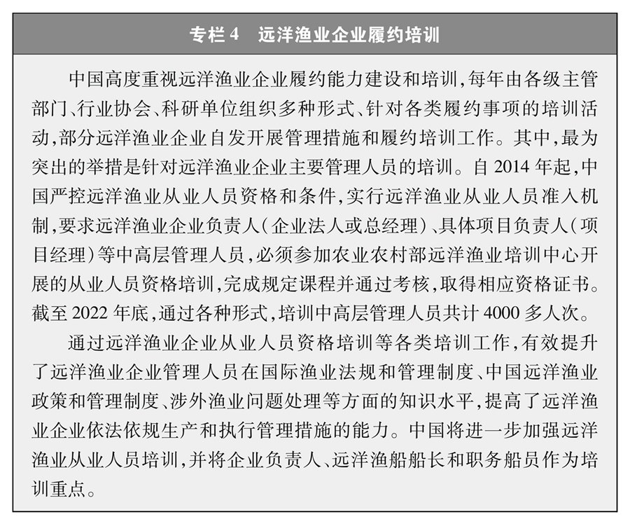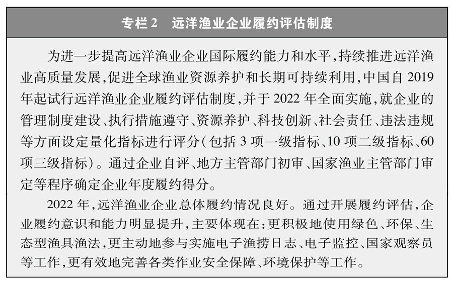 遠洋漁業(yè)企業(yè)和漁船是履行國際公約、合法合規(guī)從事漁業(yè)生產(chǎn)的主體。2022年中國正式實施遠洋漁業(yè)企業(yè)履約評估制度,將企業(yè)履約成績與行政審批、政策支持等掛鉤,通過正向激勵、反向倒逼的方式,引導企業(yè)不斷完善管理制度,嚴格執(zhí)行管理措施,避免發(fā)生違規(guī)行為,切實提高履約能力。這一制度有力促進了遠洋漁業(yè)企業(yè)規(guī)范管理和國際履約,得到了各方關(guān)注和廣泛認可。