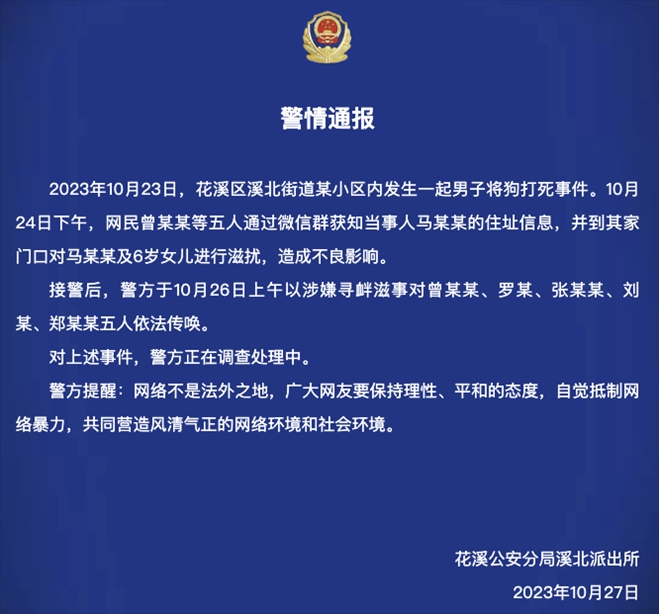 ·男子打死狗后被人上門騷擾,貴陽警方:以涉嫌尋釁滋事對涉事5人依法傳喚。
