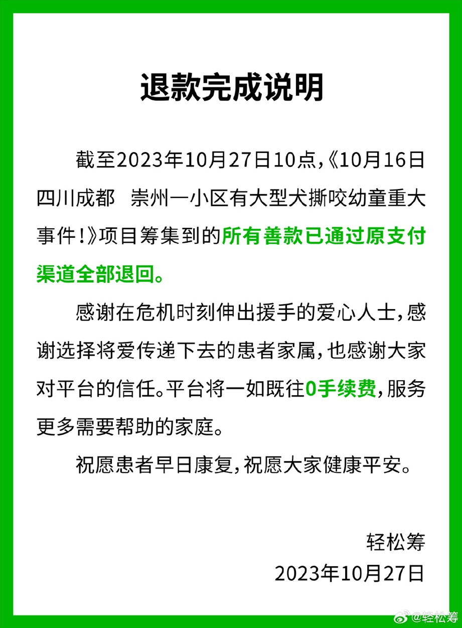 ·輕松籌平臺稱為被狗咬女童籌集的所有善款已全部退回。
