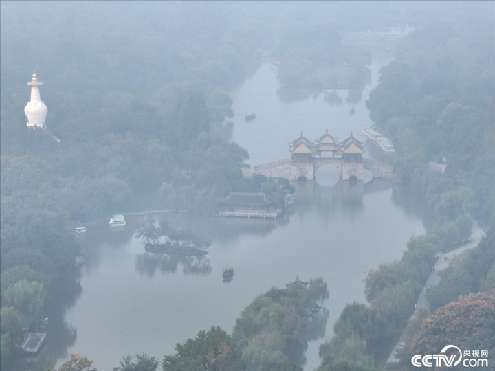 2023年10月27日, 江蘇省揚(yáng)州市出現(xiàn)大霧天氣,瘦西湖風(fēng)景區(qū)在霧中若隱若現(xiàn)、如夢似幻,宛若一幅水墨畫。