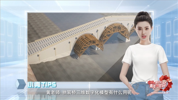 作為黃碩的好幫手,AI數(shù)字人小青給大家介紹說,三維動畫中,展現(xiàn)了拱宸橋從選址、圍堰到打樁、搭建、填碎石的全過程,拱宸橋三維數(shù)字化項目成為大運河保護傳承利用的案例之一。