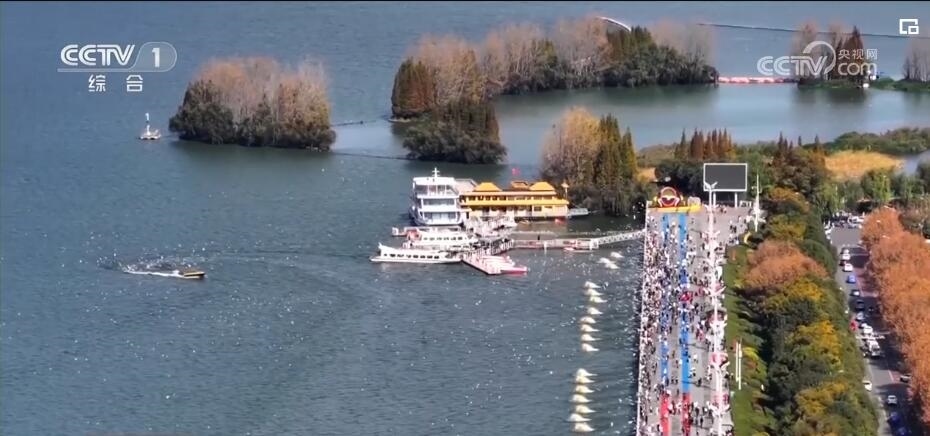 央視網(wǎng)消息:天氣轉(zhuǎn)冷,候鳥越冬南遷。成群結(jié)隊(duì)的候鳥或翱翔于濕地上空,或漫游于水面之上,與天空水面交相輝映,構(gòu)成了冬日里的一幅美麗畫卷。