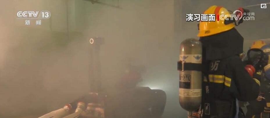 演習(xí)過程中,舉高噴射消防車從外部進行滅火作業(yè)的同時,多支消防救援小隊進入商場內(nèi)部,在濃煙中實戰(zhàn)模擬火場搜救和滅火作戰(zhàn)。在救援人員的遙控指揮下,消防救援機器狗首先突入火場,利用身上加裝的煙氣成分分析儀、攝像頭等多種設(shè)備,實時監(jiān)測環(huán)境危險狀況,并對火場環(huán)境進行偵察。在大火猛烈燃燒、建筑物結(jié)構(gòu)不穩(wěn)定情況下,消防救援人員遠程控制無人滅火機器人首先進入火場,進行前期滅火作業(yè)。為保障內(nèi)攻救援人員安全,消防員綜合定位系統(tǒng)也投入使用。每名消防員都攜帶平板終端和定位信標(biāo),指揮員可以實時掌握進入火場人員的生命體征、實時位置。一旦救援人員遇險,系統(tǒng)能夠第一時間引導(dǎo)緊急救援小組展開營救行動。