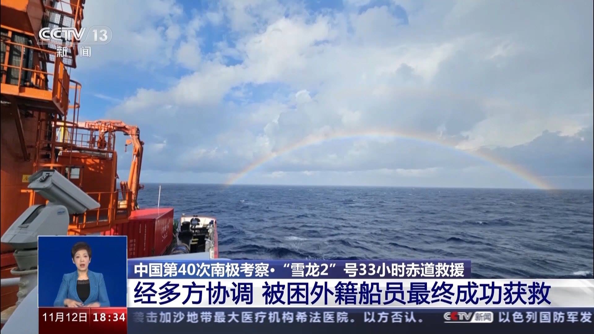 一個(gè)小時(shí)后,求救船只安全吊運(yùn)到“雪龍2”號(hào)的尾部甲板,此時(shí),原本陰雨的天空放晴,一道彩虹掛在天邊,“雪龍2”號(hào)重新起航。