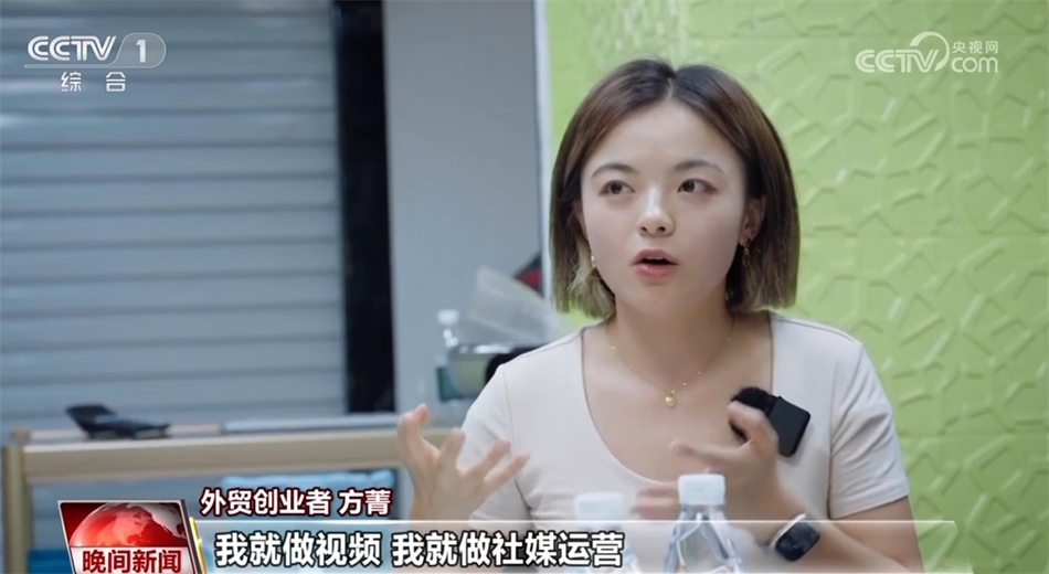 外貿(mào)創(chuàng)業(yè)者 方菁:我就做視頻,做社媒運(yùn)營(yíng)。我加入(姐姐)的時(shí)候,她每個(gè)月只發(fā)一個(gè)集裝箱,但是我們來了之后,一個(gè)月發(fā)七個(gè)集裝箱了。