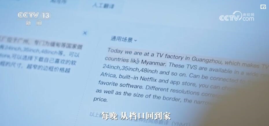 方菁:這是我們找的專門做外貿(mào)電視機(jī)的一家(工廠)。我給大家介紹一下,“大家好,我是方菁,今天我們來到了電視機(jī)工廠”。要介紹得更精密的時(shí)候,我就不知道該怎么說了。打開我的翻譯軟件,先把我要呈現(xiàn)的字幕輸入進(jìn)去。