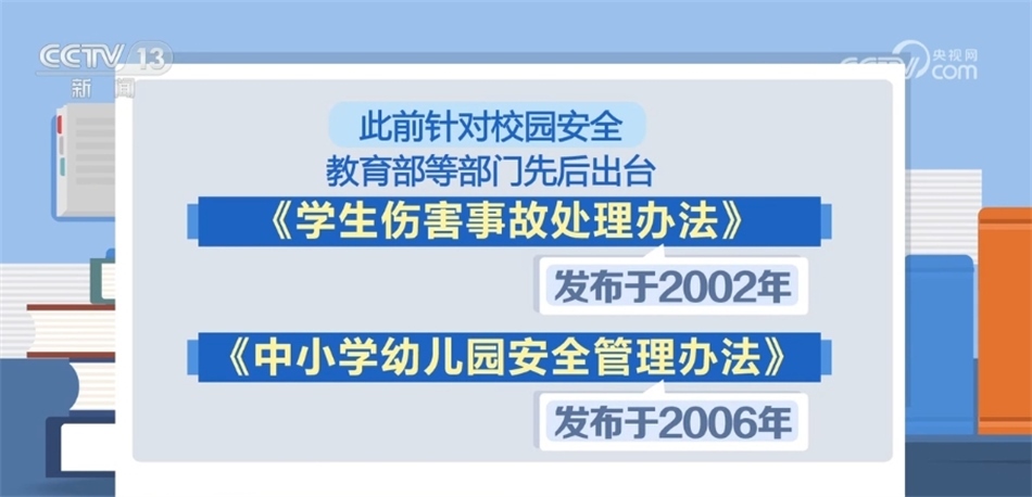 據(jù)介紹,此前針對校園安全,教育部等部門先后出臺(tái)了《學(xué)生傷害事故處理辦法》《中小學(xué)幼兒園安全管理辦法》。前者發(fā)布于2002年,后者發(fā)布于2006年,專家認(rèn)為,這兩條《辦法》作為規(guī)范性文件,制定時(shí)間久遠(yuǎn),一些規(guī)定較為籠統(tǒng),亟待更新和修訂。