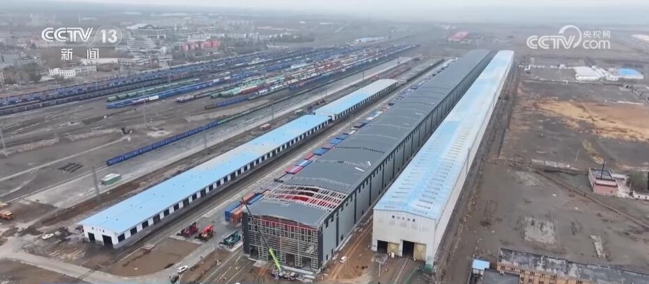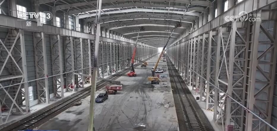 總臺(tái)記者 崔寧:在我的身后有一小一大、一舊一新兩座換裝庫(kù),它們主要是對(duì)入境的中歐班列進(jìn)行換裝。小的這座看起來(lái)也比較舊,它建于2008年,到目前為止已經(jīng)投用了整整15年。隨著“一帶一路”倡議的不斷推進(jìn),現(xiàn)在經(jīng)阿拉山口口岸出入境的中歐班列數(shù)量已經(jīng)由最初月均3.5列增加到日均17列。所以,它的存在也已經(jīng)遠(yuǎn)遠(yuǎn)不能滿(mǎn)足現(xiàn)在發(fā)展的需求,也正因?yàn)槿绱?,在它的旁邊又新建了一座大的換裝庫(kù),它建成投用之后將取而代之成為目前亞洲最大的室內(nèi)集裝箱換裝庫(kù)。