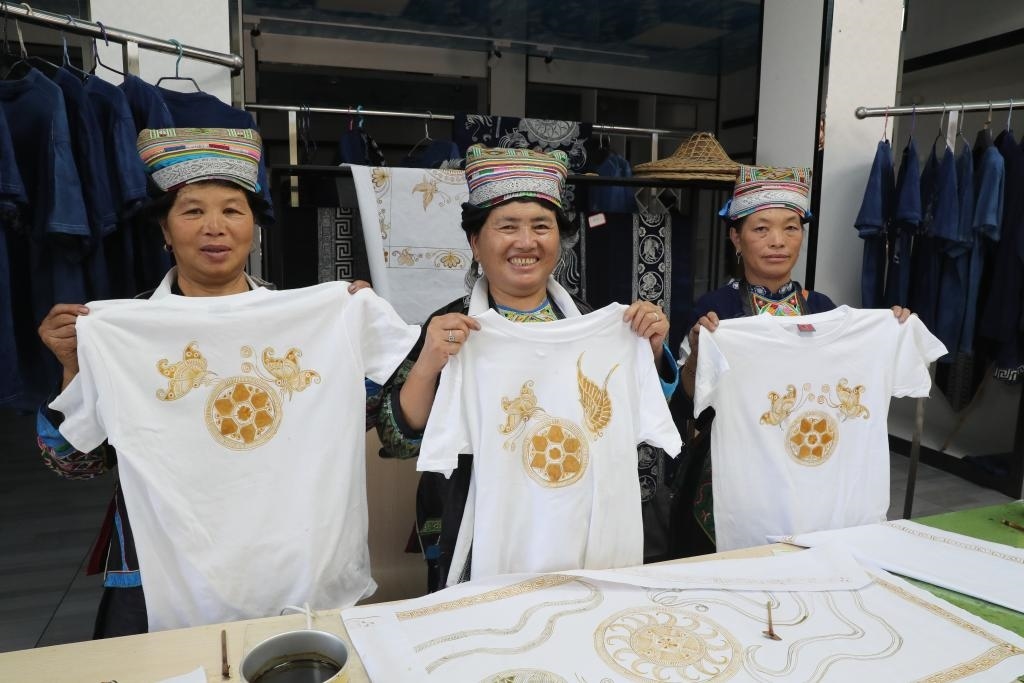 9月1日,苗族婦女姜老本(中)展示她和村民用蠟筆在T恤上畫(huà)的“村超”足球。(李長(zhǎng)華 攝)
