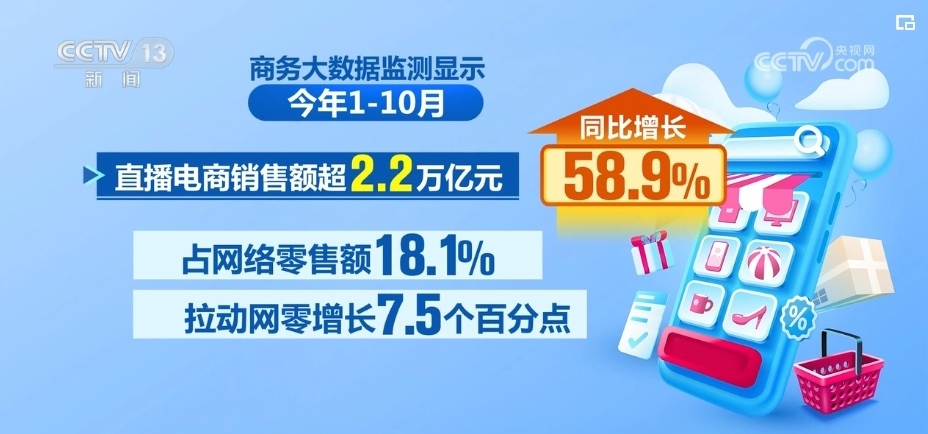 商務(wù)大數(shù)據(jù)監(jiān)測(cè)顯示,2023年1—10月份,直播電商銷售額超2.2萬(wàn)億元,同比增長(zhǎng)58.9%,占網(wǎng)絡(luò)零售額18.1%,拉動(dòng)網(wǎng)零增長(zhǎng)7.5個(gè)百分點(diǎn)。其中,中秋、國(guó)慶期間,住宿、旅游、文娛和餐飲日均在線銷售額同比分別增長(zhǎng)133.7%、123.1%、82.1%和19.7%。