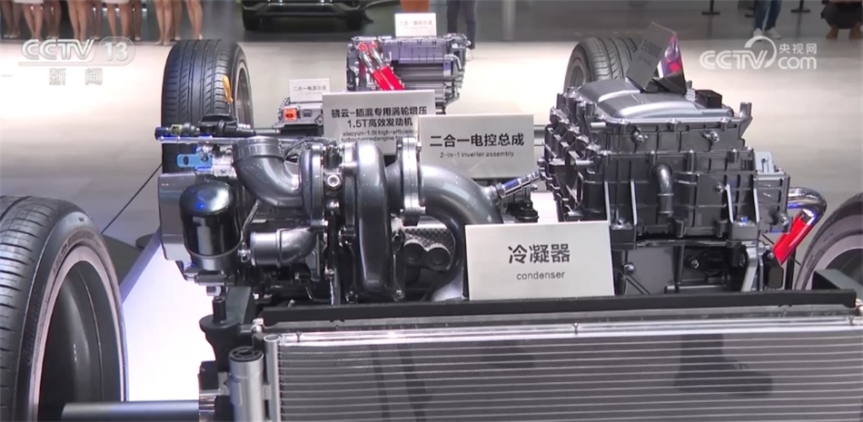 在1100多臺(tái)展車(chē)中,新能源車(chē)占比超過(guò)40%,達(dá)到469臺(tái),其中,中國(guó)品牌展出的數(shù)量為350臺(tái)。不僅是展車(chē)的數(shù)量上占了絕大多數(shù),中國(guó)品牌在新技術(shù)上也在不斷更新迭代。眼前的這個(gè)超級(jí)電驅(qū)智能技術(shù)平臺(tái),其最核心的部件——增程器,參展企業(yè)研發(fā)到了第三代,最高油電轉(zhuǎn)換率比第二代提高了近10%。
