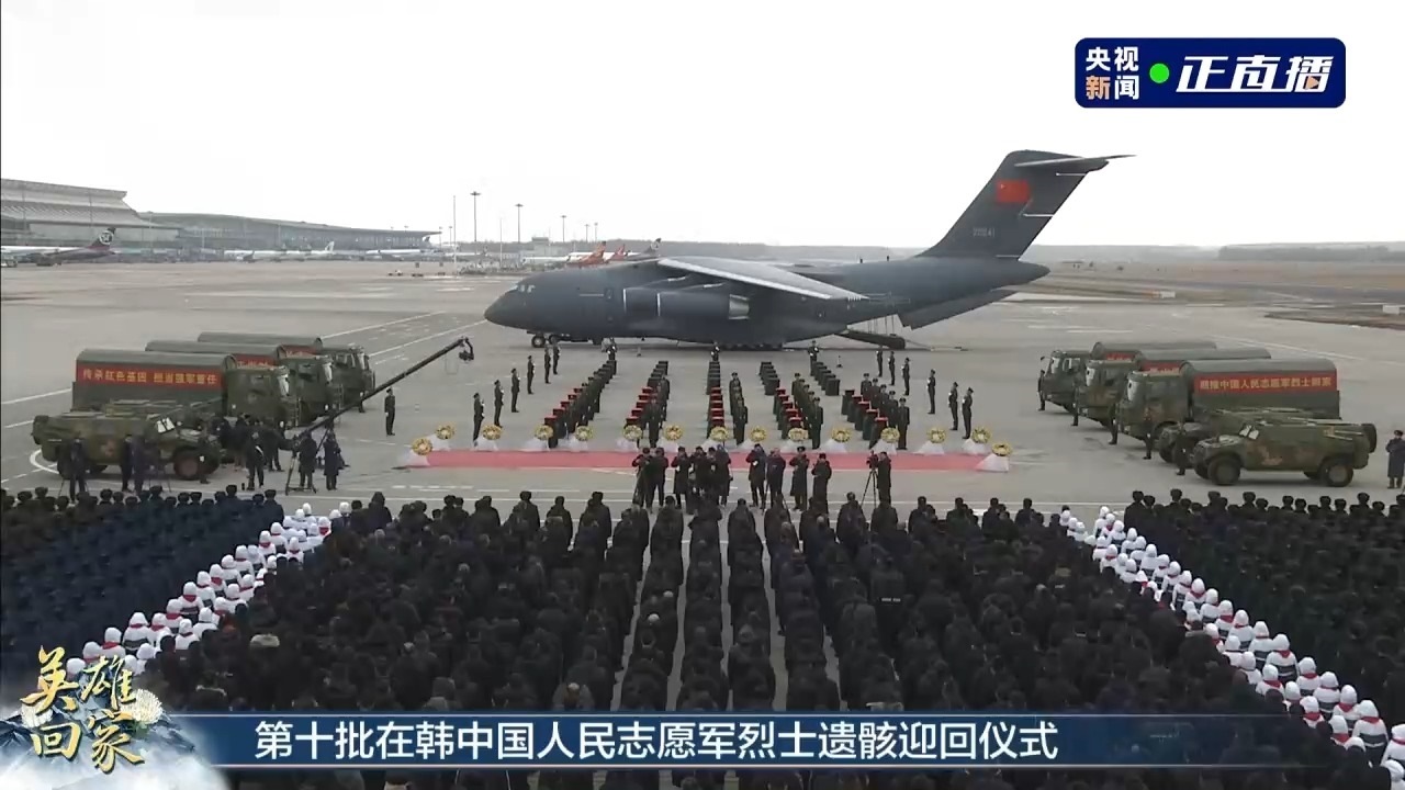 12時(shí)18分,由退役軍人事務(wù)部牽頭組織的志愿軍烈士遺骸迎回儀式在沈陽桃仙國際機(jī)場舉行。來自志愿軍烈士親屬、相關(guān)部門、部隊(duì)官兵等各界代表約1000人參加。儀式結(jié)束后,志愿軍烈士遺骸棺槨被由45輛警用摩托組成的騎警車隊(duì)護(hù)送前往沈陽抗美援朝烈士陵園。24日10時(shí),第十批在韓中國人民志愿軍烈士遺骸安葬儀式將在該陵園志愿軍烈士紀(jì)念廣場舉行。2014年至2022年,已先后有913位從韓國迎接回來的志愿軍烈士在此安息。
