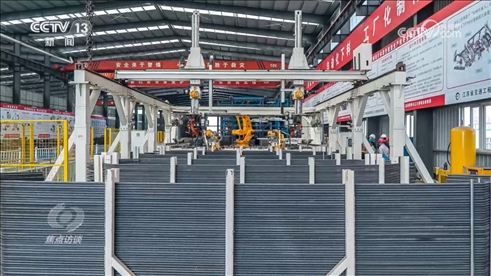中交二航局常泰長(zhǎng)江大橋項(xiàng)目部常務(wù)副經(jīng)理王輝:“傳統(tǒng)的橋塔鋼筋怎么做呢?通過吊機(jī)把鋼筋吊到塔上,作業(yè)工人一根根把鋼筋綁起來,個(gè)人能力有差別,質(zhì)量和精度,鋼筋間距也很難控制,現(xiàn)在我們采用什么理念呢?就是部品的理念,把塔的鋼筋在下面做成一塊一塊的,就像搭積木一樣,大型吊機(jī)把它吊上去,然后一節(jié)節(jié)堆起來。”