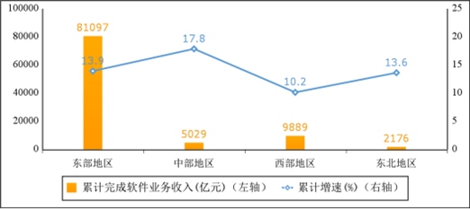 西部地區(qū)軟件業(yè)務(wù)收入小幅提升,中部地區(qū)增勢(shì)突出。1—10月份,東部地區(qū)完成軟件業(yè)務(wù)收入81097億元,同比增長(zhǎng)13.9%,增速較前三季度回落0.2個(gè)百分點(diǎn);中部地區(qū)完成軟件業(yè)務(wù)收入5029億元,同比增長(zhǎng)17.8%,增速較前三季度提高5.7個(gè)百分點(diǎn);西部地區(qū)完成軟件業(yè)務(wù)收入9889億元,同比增長(zhǎng)10.2%,增速較前三季度提高0.3個(gè)百分點(diǎn);東北地區(qū)完成軟件業(yè)務(wù)收入2176億元,同比增長(zhǎng)13.6%,增速與前三季度持平。四個(gè)地區(qū)軟件業(yè)務(wù)收入在全國(guó)總收入中的占比分別為82.6%、5.1%、10.1%和2.2%。