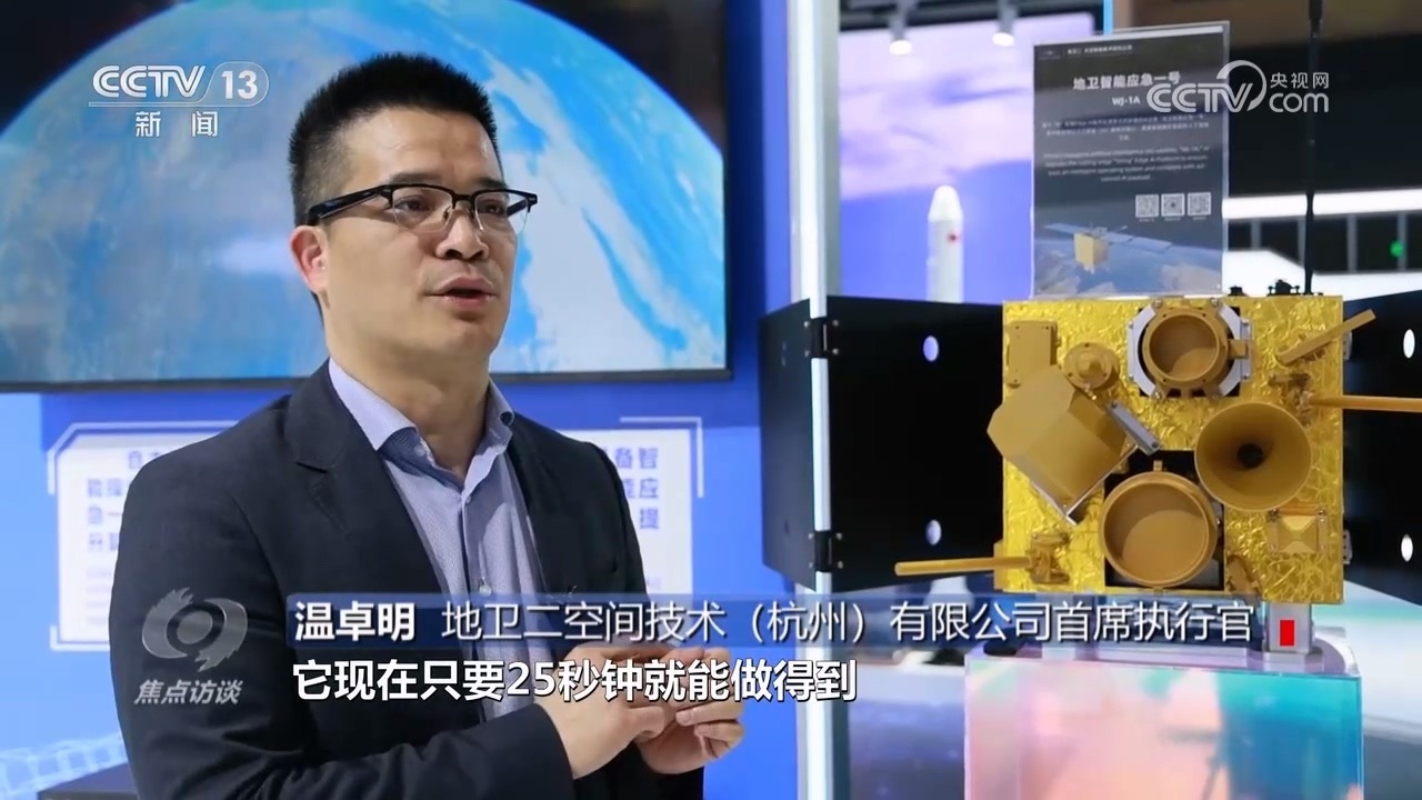 地衛(wèi)二空間技術(shù)(杭州)有限公司首席執(zhí)行官溫卓明:“這是一個(gè)聰明的衛(wèi)星,傳統(tǒng)的衛(wèi)星6個(gè)小時(shí)才能干完的事情,它只要25秒鐘就能做得到,而且原來(lái)可能要5000個(gè)工程師干的活,現(xiàn)在1個(gè)小時(shí)它就能做完。它是怎么能做到的?因?yàn)槲覀儼讶斯ぶ悄芊诺搅颂??!?/p>