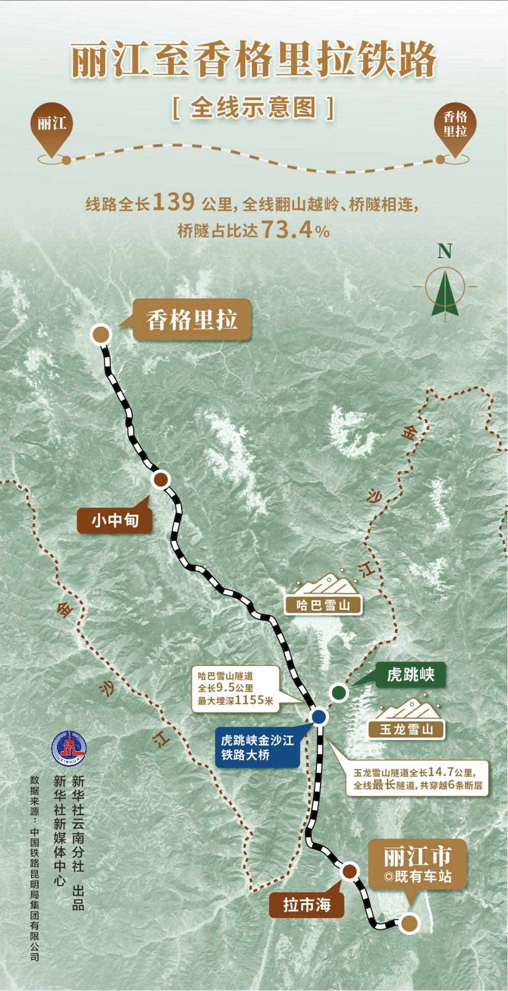 2023年11月26日,麗江至香格里拉鐵路正式開通運營,鐵路全長139公里,設(shè)計時速140公里,為國家I級單線電氣化鐵路,兩地間最快1小時18分可達(dá)。