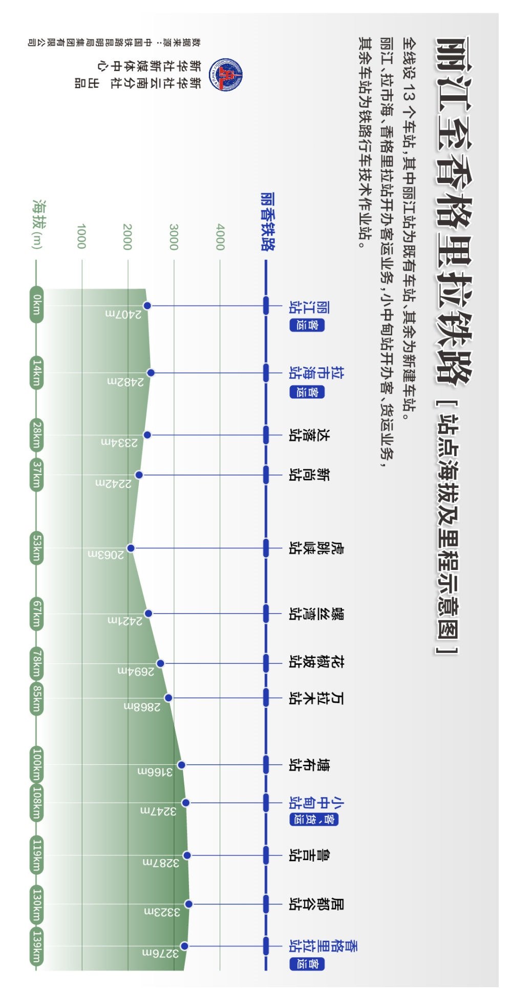 全線共設(shè)有13個車站,其中麗江站為既有車站,其余為新建車站。麗江、拉市海、香格里拉站開辦客運業(yè)務(wù),小中甸站開辦客、貨運業(yè)務(wù),其余車站為鐵路行車技術(shù)作業(yè)站。