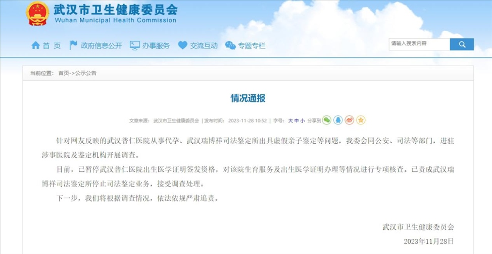 ·武漢衛(wèi)健委通報“普仁醫(yī)院從事代孕、武漢瑞博祥司法鑒定所出具虛假親子鑒定”情況。