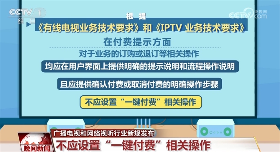 在付費提示方面,對于業(yè)務(wù)的訂購或退訂等相關(guān)操作,均應(yīng)在用戶界面上提供明確的提示說明和流程操作說明,且應(yīng)提供確認付費或取消付費的明確操作步驟,不應(yīng)設(shè)置“一鍵付費”相關(guān)操作。此外,有線電視和IPTV遙控器應(yīng)具備快捷看直播頻道的按鍵,通過此按鍵直接進入全屏直播,按鍵名稱應(yīng)為“看電視”。