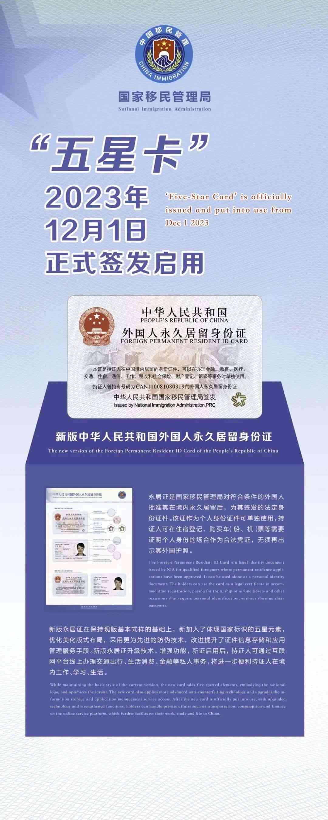 央視網(wǎng)消息:據(jù)國(guó)家移民管理局,新版中華人民共和國(guó)外國(guó)人永久居留身份證12月1日正式簽發(fā)啟用。因加入了體現(xiàn)國(guó)家標(biāo)識(shí)的五星元素,新版永居證被稱為“五星卡”。首日共有50名取得在華永久居留資格的外國(guó)人領(lǐng)取到了首批“五星卡”。他們來(lái)自美國(guó)、德國(guó)、英國(guó)、法國(guó)、俄羅斯、瑞典、新加坡、韓國(guó)等二十余個(gè)國(guó)家,均為在經(jīng)濟(jì)、教育、科技、文化、衛(wèi)生等多個(gè)領(lǐng)域?yàn)橹袊?guó)經(jīng)濟(jì)社會(huì)發(fā)展做出了突出貢獻(xiàn)人員,當(dāng)中包括中國(guó)政府友誼獎(jiǎng)獲得者,在華長(zhǎng)期任職工作的外籍高層次管理和專業(yè)技術(shù)人員,在重點(diǎn)院校、科研機(jī)構(gòu)長(zhǎng)期從事教學(xué)科研的外籍教授學(xué)者等。當(dāng)天,在北京、天津、上海、廣東等地公安機(jī)關(guān)出入境辦證窗口,還有不少永久居留外國(guó)人前來(lái)咨詢申請(qǐng)換發(fā)“五星卡”。