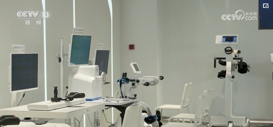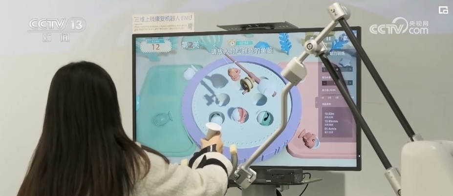 總臺記者 竇筠韻:幫助病人進(jìn)行康復(fù)的機(jī)器人,可以根據(jù)病人手部力量的多少進(jìn)行輔助推力,機(jī)器界面上還有各種有趣的游戲,使得康復(fù)訓(xùn)練不無聊。