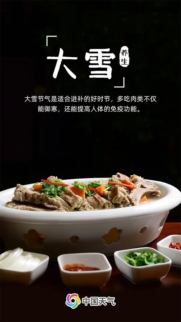 大雪也是適合進補的好時節(jié)。冬天的寒冷為放肆吃肉提供了充足的理由,肉類不僅能為我們的身體提供足夠的熱量以抵御嚴(yán)寒,還能提高人體的免疫功能,促進新陳代謝。不過,進補也要有“度”,除了吃肉,也要適當(dāng)吃一些新鮮的水果和蔬菜,做到營養(yǎng)均衡。