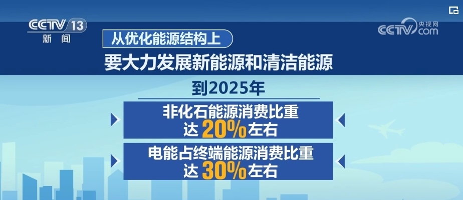 從優(yōu)化能源結(jié)構(gòu)上,要大力發(fā)展新能源和清潔能源。到2025年,非化石能源消費(fèi)比重達(dá)20%左右,電能占終端能源消費(fèi)比重達(dá)30%左右。持續(xù)增加天然氣生產(chǎn)供應(yīng),新增天然氣優(yōu)先保障居民生活和清潔取暖需求。