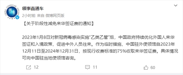·外交部領(lǐng)事保護(hù)中心:階段性減免來華簽證費(fèi)。