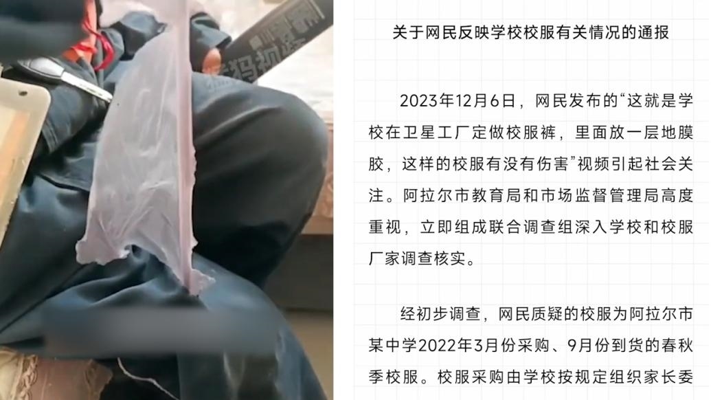 ·新疆阿拉爾官方通報(bào)校服褲夾層扯出疑似塑料膜:系脫落的校褲內(nèi)部復(fù)膜,已送檢。