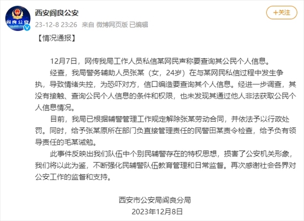 ·西安閻良公安通報(bào)警務(wù)輔助人員稱要查網(wǎng)友個(gè)人信息:解除勞動(dòng)合同,予以行政處罰。