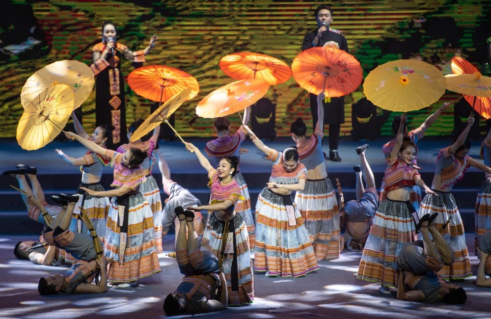 2023年1月18日,以“同心筑厚誼 攜手共發(fā)展”為主題的2023年中越跨國春節(jié)聯(lián)歡晚會在中國云南省紅河哈尼族彝族自治州河口瑤族自治縣舉行,越南老街省民族藝術(shù)歌舞團的演員在晚會上表演歌舞《漂浮在云端的節(jié)日》。