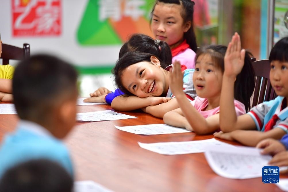 在廣西柳州市融水苗族自治縣易地扶貧搬遷安置小區(qū)苗家小鎮(zhèn)青年之家“六點(diǎn)小課堂”,孩子們參與興趣活動(dòng)(2022年5月5日攝)。近年來(lái),廣西柳州市融水苗族自治縣團(tuán)縣委在易地扶貧搬遷安置小區(qū)苗家小鎮(zhèn)、苗美社區(qū)開設(shè)青年之家“六點(diǎn)小課堂”,定期組織青年志愿者,為這里的青少年開展功課輔導(dǎo)、自護(hù)教育、科技小課堂等活動(dòng)。新華社記者 黃孝邦 攝