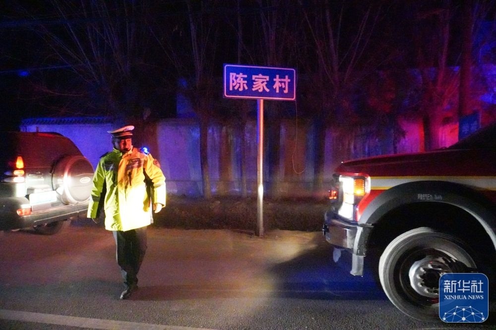 12月19日,在甘肅省臨夏回族自治州積石山保安族東鄉(xiāng)族撒拉族自治縣大河家鎮(zhèn)陳家村,一名交警指揮救援車輛進(jìn)入救援現(xiàn)場。新華社記者 馬希平 攝