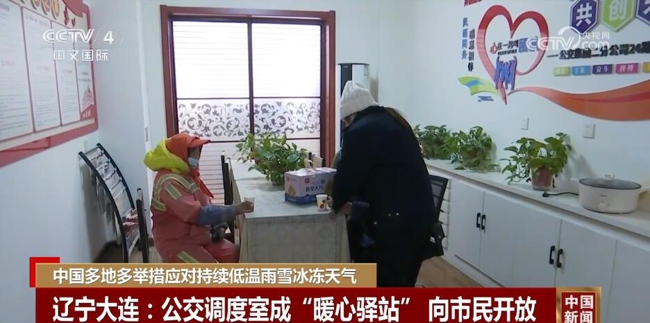 在遼寧大連,嚴(yán)寒天氣下,一些臨近居民區(qū)、菜市場(chǎng)、商業(yè)區(qū)的公交調(diào)度室臨時(shí)向市民開(kāi)放,供路過(guò)市民歇腳、暖身。