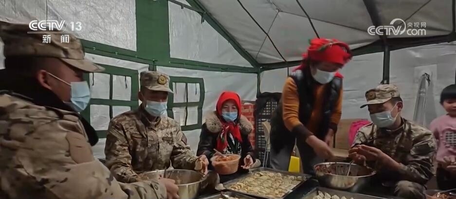 在青海民和中川鄉(xiāng)草灘村美一小學(xué)安置點(diǎn),官兵們準(zhǔn)備食材和面剁餡,他們要在這個(gè)特殊的日子,讓受災(zāi)群眾吃上一碗熱騰騰的餃子。帳篷里,群眾和官兵分工協(xié)作,處處洋溢著“家”的溫馨。