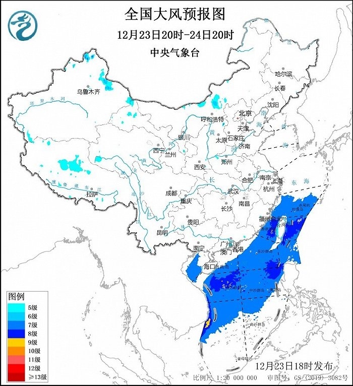 中央氣象臺12月23日18時繼續(xù)發(fā)布大風藍色預警:預計,12月23日20時至24日20時,東海南部海域、臺灣海峽、臺灣以東洋面、巴士海峽、南海大部海域、北部灣將有7~8級、陣風9~10級的東北風,其中南海西南部的部分海域風力可達9級、陣風10級。