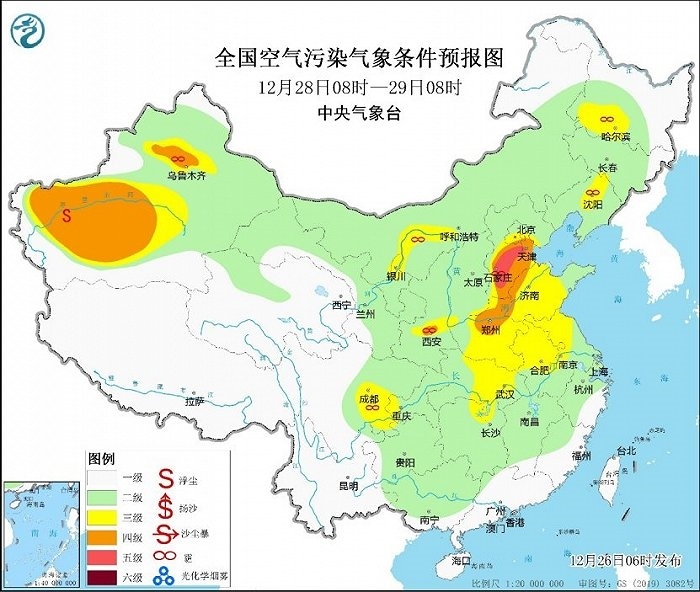 冷空氣勢力弱,霧和霾天氣又要登場。今天,華北、黃淮等地有輕度霾,局地中度或重度霾,27日華北中南部大氣擴散條件將有所改善。28日至30日,華北中南部、黃淮中西部、汾渭平原等地大氣擴散條件再次轉(zhuǎn)差,將有輕至中度霾,部分地區(qū)重度霾。此外,28日至30日的夜間至上午時段,華北中南部、黃淮、江淮東部、江漢、四川盆地等地的部分地區(qū)有大霧,局地有能見度不足200米的強濃霧。