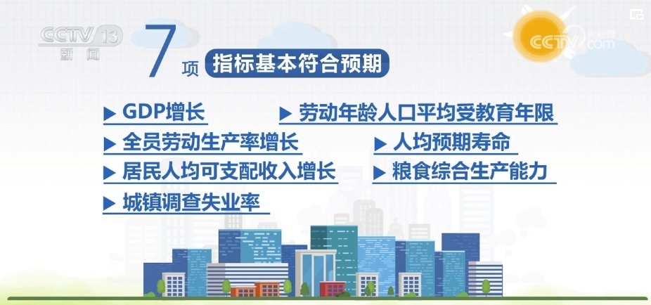 7項指標基本符合預(yù)期,分別是GDP增長、全員勞動生產(chǎn)率增長、居民人均可支配收入增長、城鎮(zhèn)調(diào)查失業(yè)率、勞動年齡人口平均受教育年限、人均預(yù)期壽命、糧食綜合生產(chǎn)能力。